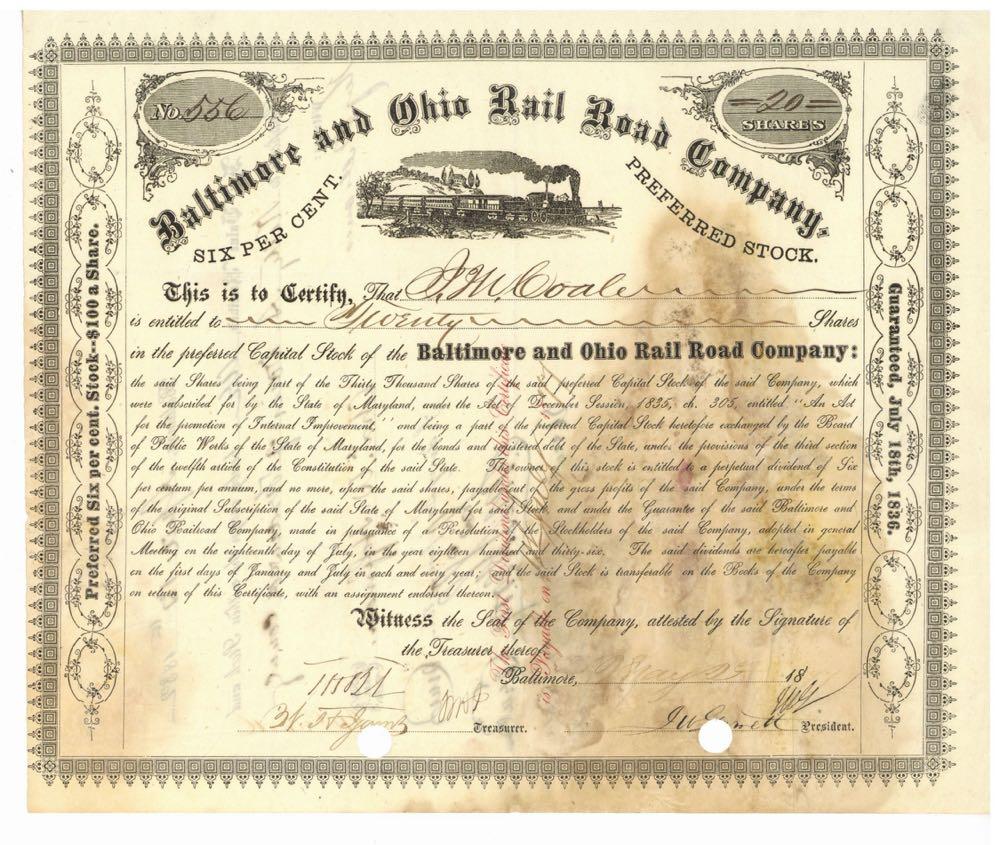 Baltimore and Ohio Rail Road Company. Preferred stock. Smoking locomotive pulling passenger train. 1890s. Staining at right similar to photo. Light folds.