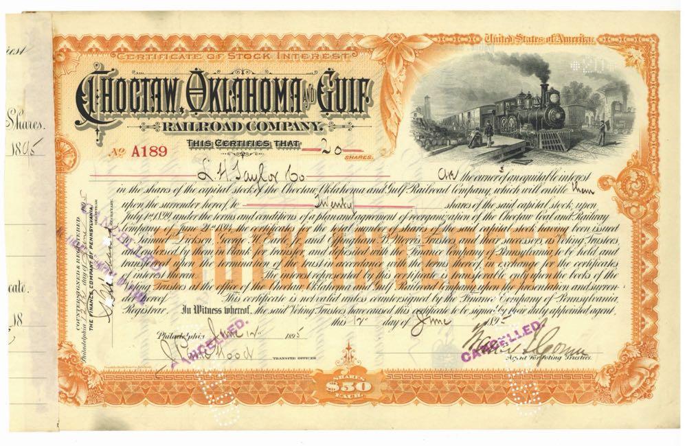 Choctaw, Oklahoma and Gulf Railroad Company. Freight train beside loading dock. Vignette at upper right. 1890s. Stub remnant at left.