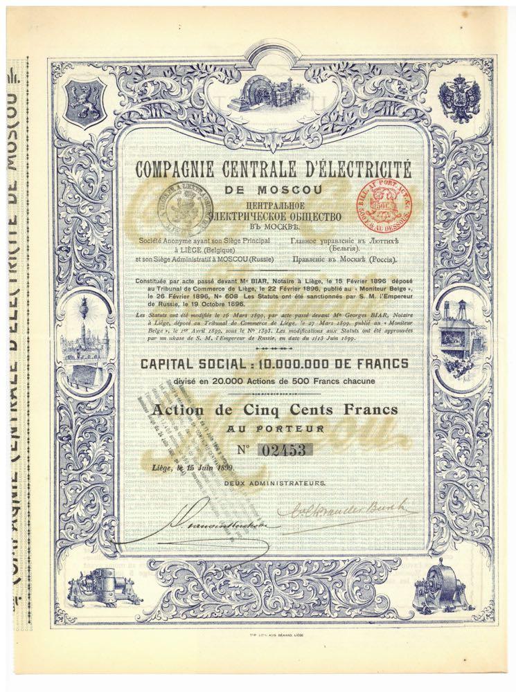 Compagnie Centrale D'Electricite de Moscou. Seven vignettes showing generators, motors, lights and national seals are incorporated into the frame. This is a dual issue bond for Russia and Belgium. 1899. Uncancelled. Coupons. In French and Russian.