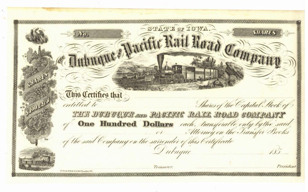 Dubuque and Pacific Rail Road Company. Smoking funnel stack engine pulling passenger train beside lake. Additional small train vignette at lower left. Dubuque, Iowa. Unissued but dated 185_.