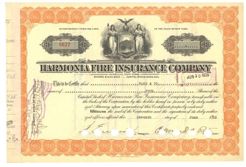 Harmonia Fire Insurance Company. State seal. Buffalo, New York. 1928. Stub remnant at left.