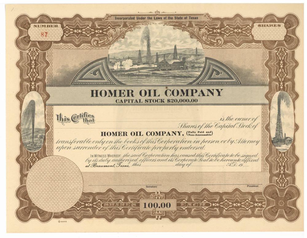 Homer Oil Company. Oil field with gushing well. Two small gushers form part of border. Texas. Unissued.