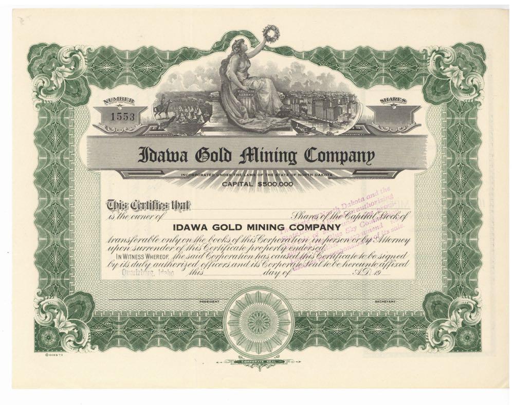 Idawa Gold Mining Company. Lady with wreath, teepees, city. Incorporated in North Dakota. Issued from Quartzburg, Idaho. Unissued. Vertical fold