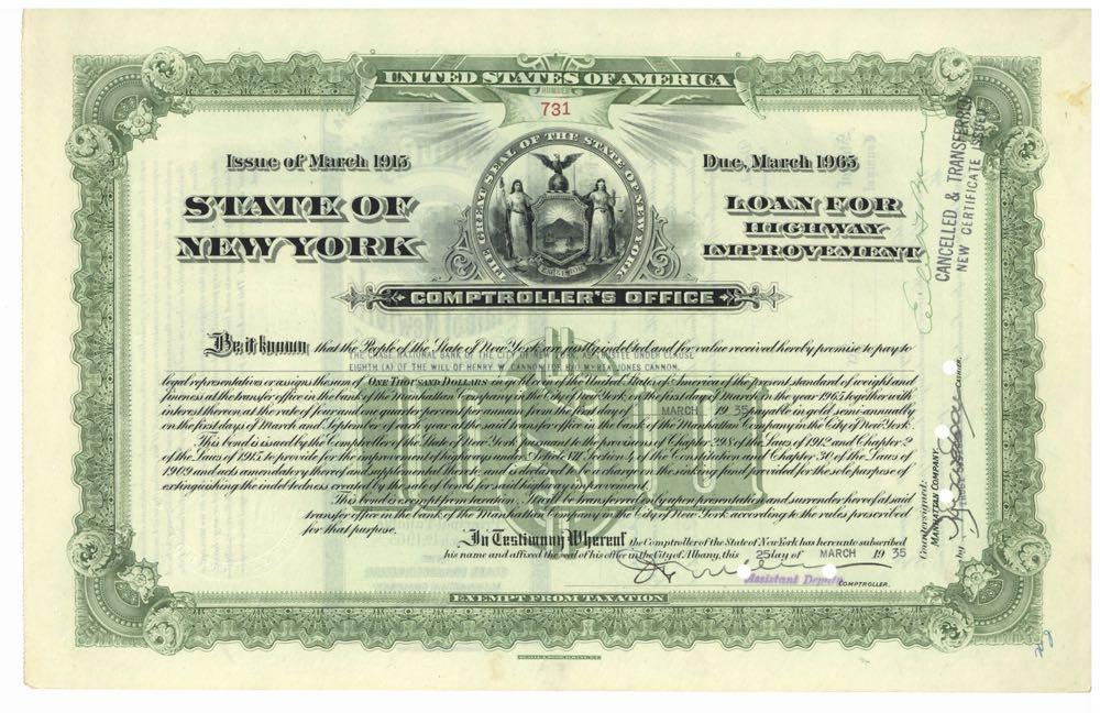 New York, State of. Highway Improvement. State seal of New York at top center. 1950s. Horizontal format bond. Vertical fold.