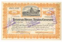 Tonopah Divide Mining Company. Winged battle axe. Nevada. 1910s. V shaped cut-outs at bottom to cancel certificate. Edge splits taped on reverse. $5.00