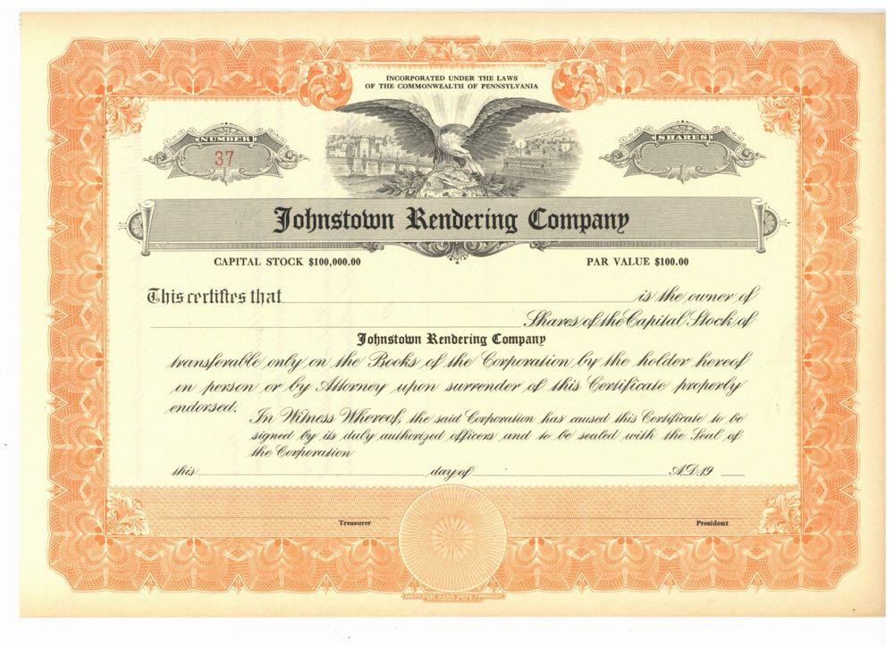 Johnstown Rendering Company. Eagle vignette with city, tiny streetcar and tugboat. Pennsylvania. Unissued.