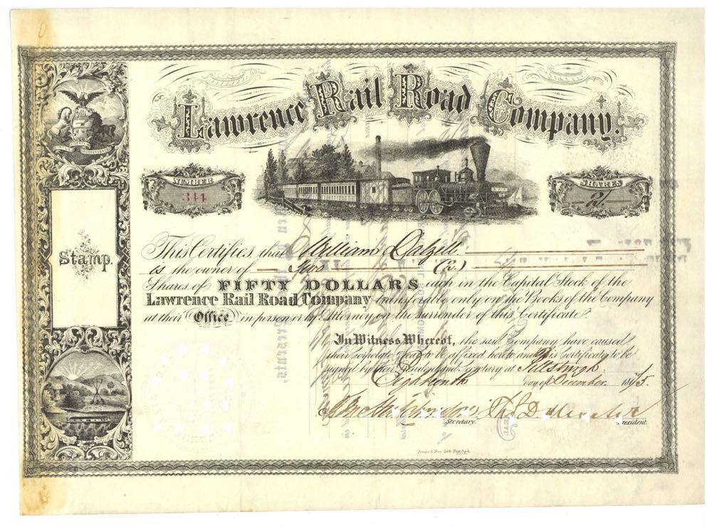 Lawrence Rail Road Company. Three vignettes, one showing smoking train, one is the state seal of Pennsylvania. Pittsburgh, Pennsylvania.. Glue residue at left. You will receive the same certificate pictured.