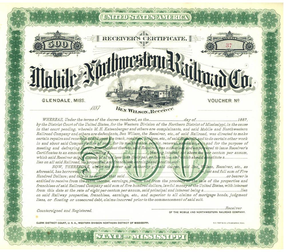 Mobile and Northwestern Railroad Company. Train, steamboat. Receivers's certificate. This is a bond to raise money for repair of the railroad and it had prior claim over the previously issued bonds. Mississippi. 1887. Unissued. Vertical fold