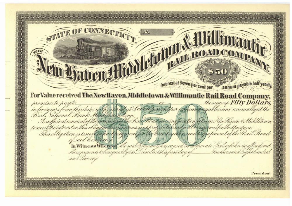 New Haven, Middletown & Willimantic Rail Road Company. Smoking engine pulling train. Connecticut. Unissued, dated 1870. Horizontal format bond. Denomination printed in. Vertical fold