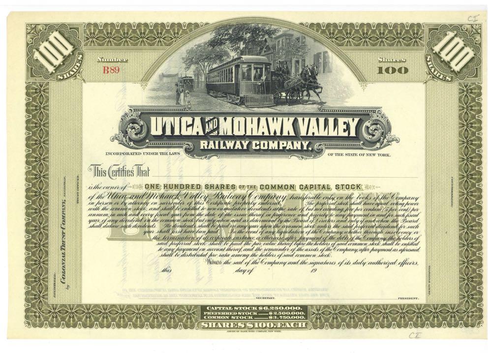 Utica and Mohawk Valley Railway Company. Electrified trolley with horse drawn coach along side. New York. Unissued. Light fold