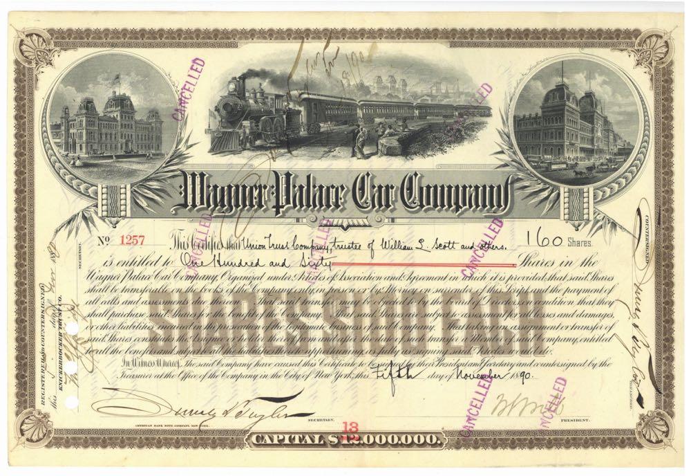 Wagner Palace Car Company. Train rounding curve at center, terminal buildings at left and right. 1880s-90s, by ABN. signed by Webb. Pen cancel affects vignette. You will receive the same certificate pictured.