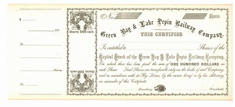 Green Bay & Lake Pepin Railway Company. [Bargain Lot of 6 pieces] Dogs head at bottom. Arched name. Unissued but dated 186_.