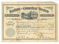 Hartford and Connecticut Western Railroad Company. Nineteenth century passenger train passing by farm with man plowing, hay wagons. Connecticut. 1881. Small piece torn from upper right corner. You will receive the same certificate pictured. $24.00