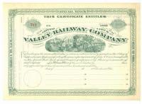 Valley Railway Company. Smoking funnel stack locomotive in center of certificate is hauling loaded coal cars. Cleveland, Ohio. Unissued but dated 18__. $8.00