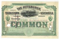 Pittsburgh, Youngstown and Ashtabula Railroad Co. Steam engine, engineer in cab. 1890s. Glue residue at left. You will receive the same certificate pictured. $8.00