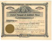 NEW! United Tonopah & Goldfield Mines. Arizona. 1906. Paper clip stain upper left, 1cm tear at right margin. You will receive the certificate pictured. $8.00