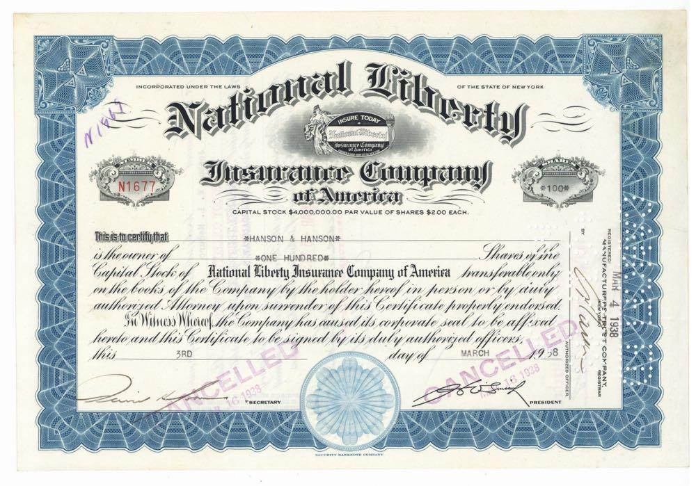 National Liberty Insurance Company. Motto "Insure Today" with company logo. New York. 193Os.