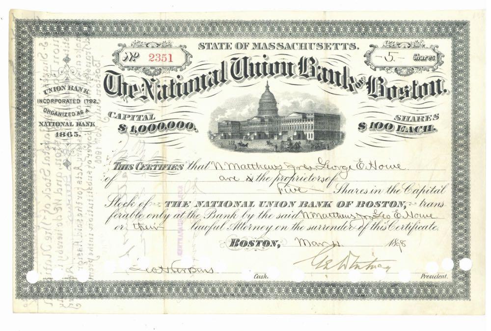 National Union Bank of Boston. Capital building with horse drawn coaches. Massachusetts. 1890s. Cancel holes across bottom