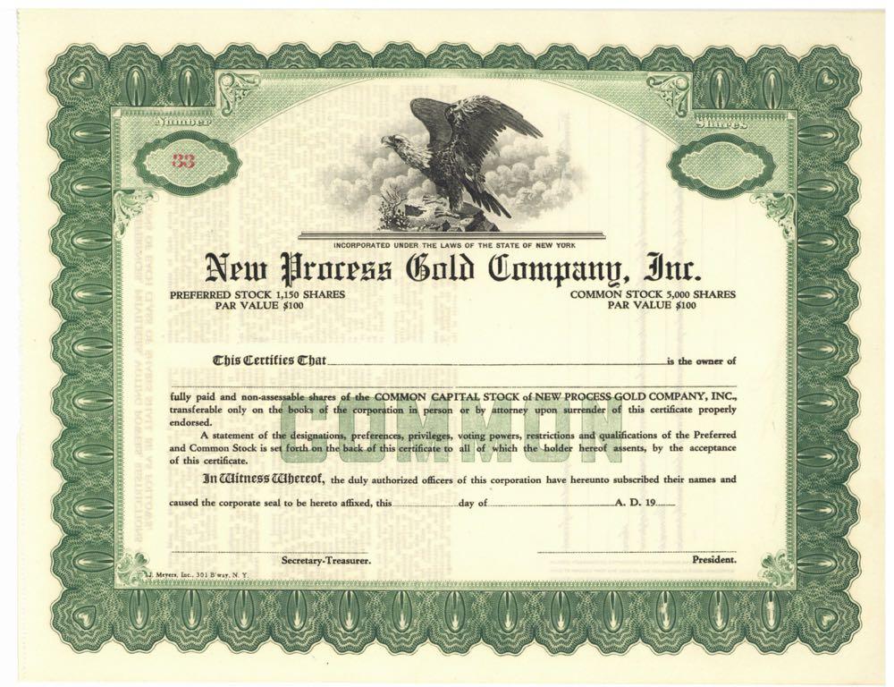 New Process Gold Company, Inc. Eagle on mountain. New York. Unissued.