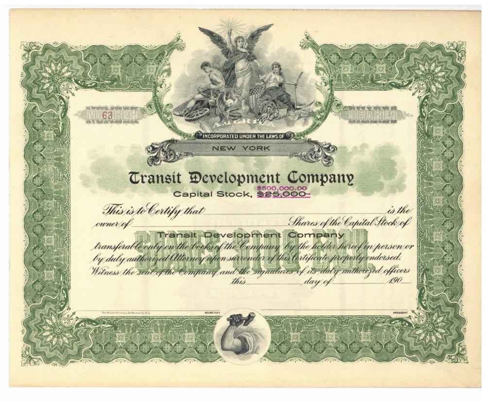 Transit Development Company. Angel with light, man, woman. Arm with hammer at bottom. New York. Unissued. 190_. Tiny edge splits taped on reverse.