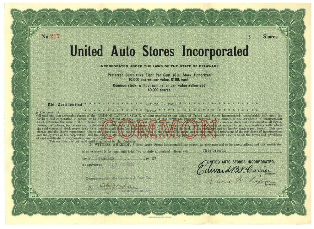 United Auto Stores Incorporated. No vignette. Delaware. 1920. Uncancelled. Vertical fold