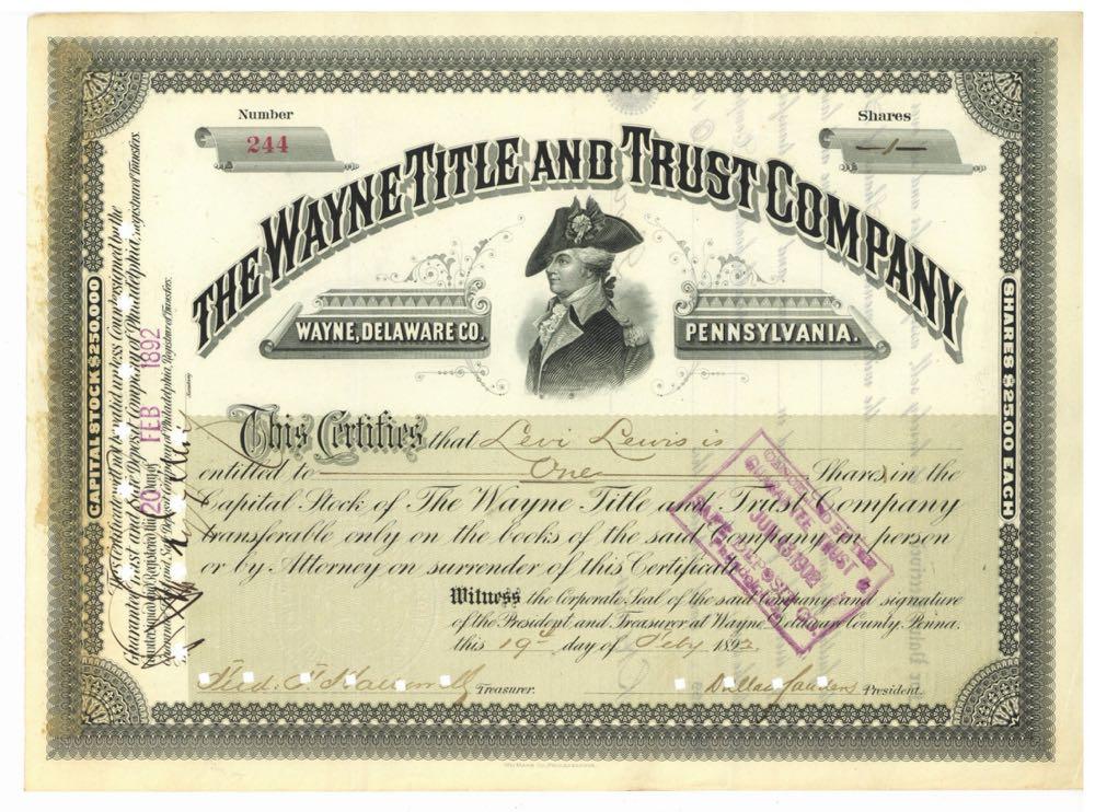 Wayne Title and Trust Company. Colonial military officer. Wayne, Pennsylvania. 1891. Light glue stain at left.