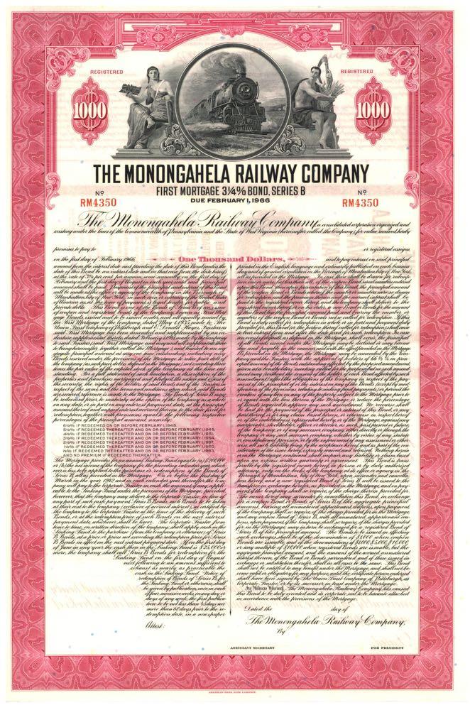 Monongahela Railway Company. [Bargain Lot of 8 pieces] Smoking twentieth century steam engine. Pennsylvania and West Virginia. 1935. Unissued. Vertical format bond. by ABN. Horizontal fold