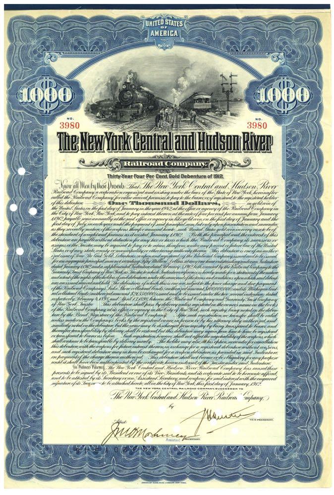 New York Central and Hudson River Railroad Company. [Bargain Lot of 7 pieces] Two trains, track workers. Vertical format gold bond. 1912. by ABN