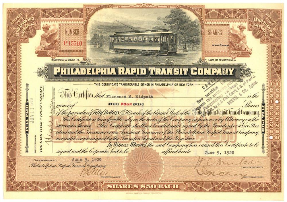 Philadelphia Rapid Transit Company. [Bargain Lot of 5 pieces, green] Electric trolley car with people inside and on street. Pennsylvania. 1920s. by ABN