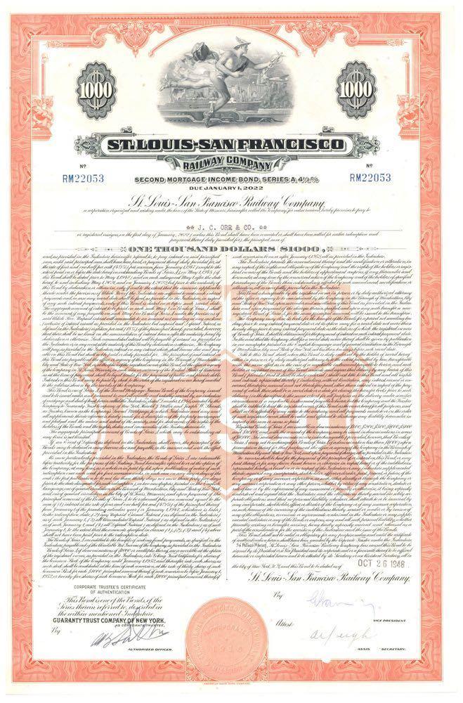 St. Louis-San Francisco Railway Co. [Bargain Lot of 10 pieces, orange] Man in front of city with ship, airplane, autos. 1950. Vertical format bond. by ABN Horizontal fold