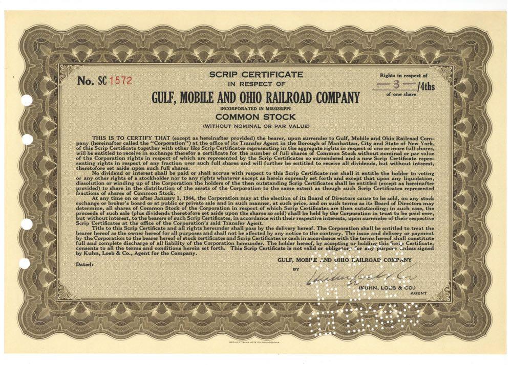 Gulf, Mobile and Ohio Railroad Company. No vignette. Mississippi. 1941. Scrip certificate for common stock. by SBN