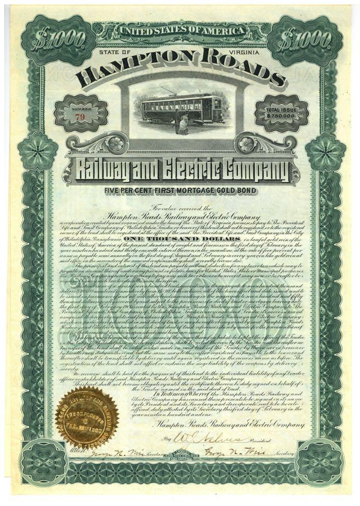 Hampton Roads Railway and Electric Company. Street car with couple waiting. Virginia. 1901. Uncancelled. Vertical format bond. by E.A. Wright.