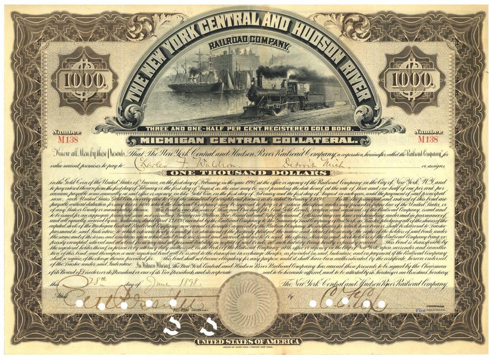 New York Central and Hudson River Railroad Company. Steam engine traveling on dock, steamship. Inscribed' Michigan Central Collateral'. 1890s. Horizontal format bond. by ABN