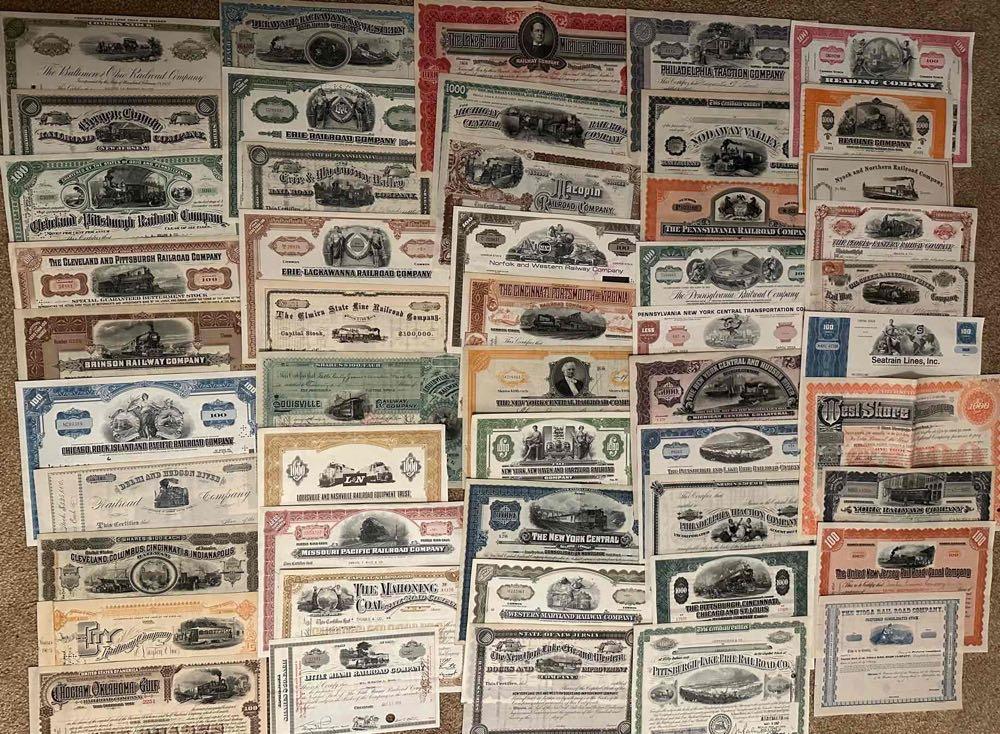 Mixed Lot of 50 Different Railroad Stock Certificates and Bonds. All have a vignette. 40 are issued, 10 are unissued. Large certificates are folded. Varieties vary from the photo