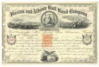 Boston and Albany Rail Road Company. Very attractive harbor scene extending the width of the certificate. Train on left, sailing ships. Massachusetts, New York seals. You will receive the same certificate pictured. $129.00